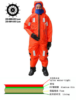 DBF-I型浸水保温服 是按照SOLAS公约、IM0规范要求设计生产的,供船舶及海上作业平上的作业人员在寒冷水域、恶劣环境中进行救生、保温的专用服装。它由防水面料和保温浮力材料制造,将衣裤、手套、耐油靴连成一体,遮盖除脸部以外的整个身体,具有浮力、水密和自然保温功能,配有救生衣灯和救生哨笛,不需加穿救生衣,是各航区航行船舶和海上平台必备的个人救生器材。
