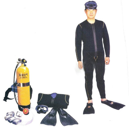 空气自携式开放回路单管咬嘴型潜水装具是轻潜装具,由咬嘴呼吸器,口鼻半面罩,空气气瓶,减压阀,湿式潜水服,脚蹼,压铅组成,广泛用于潜水旅游,水产养殖,渔业捕捞,水下施工,水下救援等。